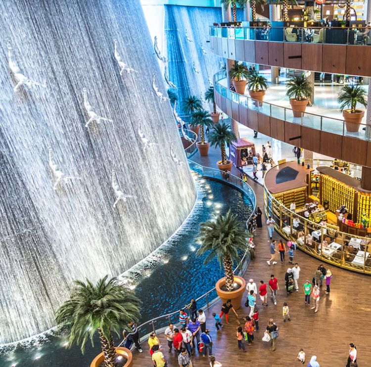 O segundo maior shopping center do mundo com mais de 1.200 lojas de todos os tipos e para todos os bolsos, tem pista de patinação de gelo e até um aquário com mais de 300 espécies de animais, incluindo tubarões e mantas. O que mais impressiona aqui, além das lojas é o show das fontes, o maior espetáculo de águas dançantes do mundo. O evento durante o dia é às 13h e às 13h30 e às sextas-feiras é às 13h30 e às 14h. À noite, é quando o lugar se transforma com as luzes acesas e as apresentações acontecem de meia e meia hora, das 18h às 23h. Durante os shows, que são acompanhados por uma iluminação espetacular e por músicas criadas especialmente para o evento, as águas podem atingir uma altura de 140 metros de altura.