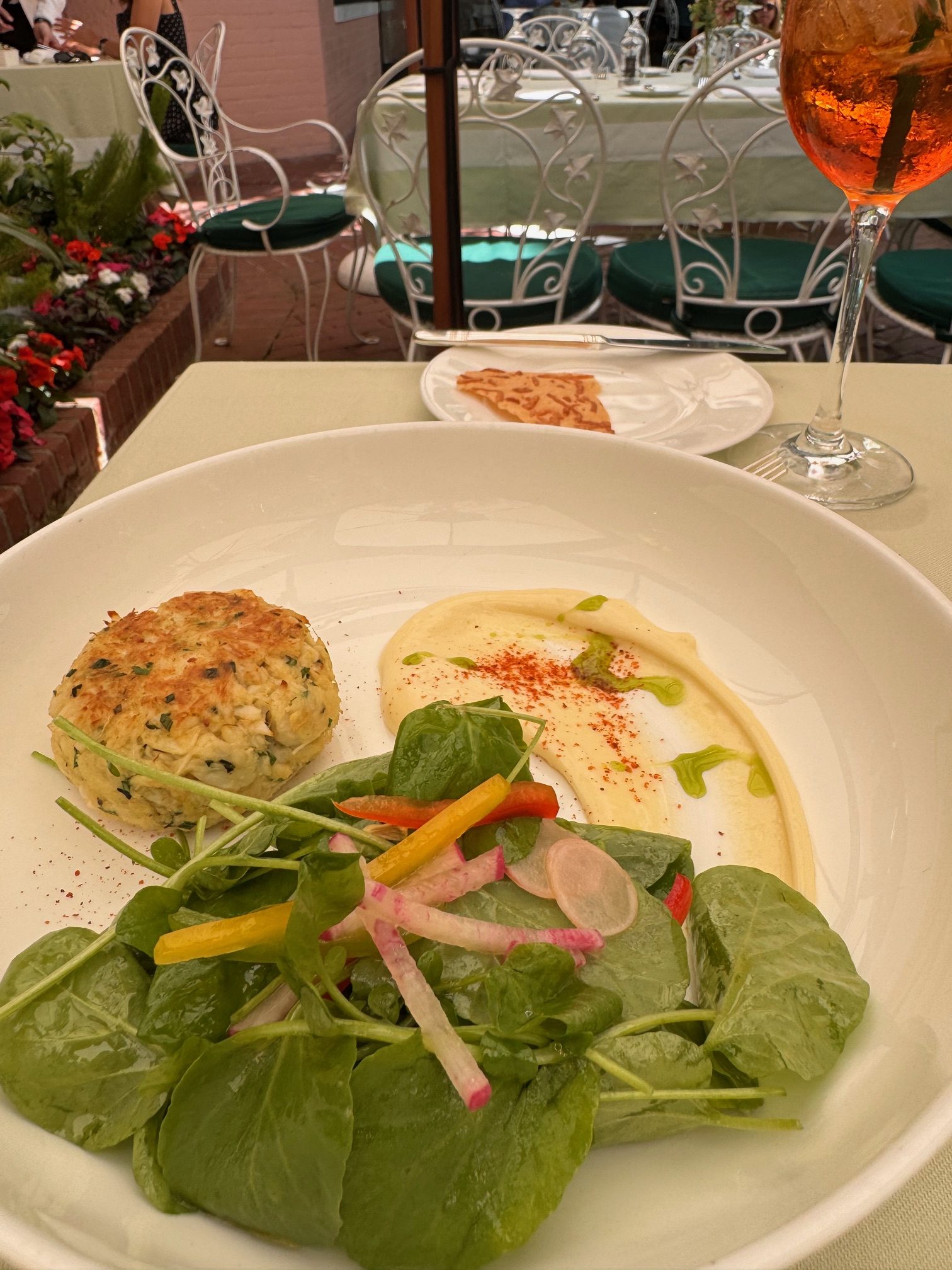Meu acompanhante optou pelo bolinho de caranguejo com agrião, rabanete, aioli de limão e vinagrete de mostarda em conserva. A casquinha apresentava uma textura firme, com interior macio e sabor doce, realçado por notas cítricas e levemente picantes.