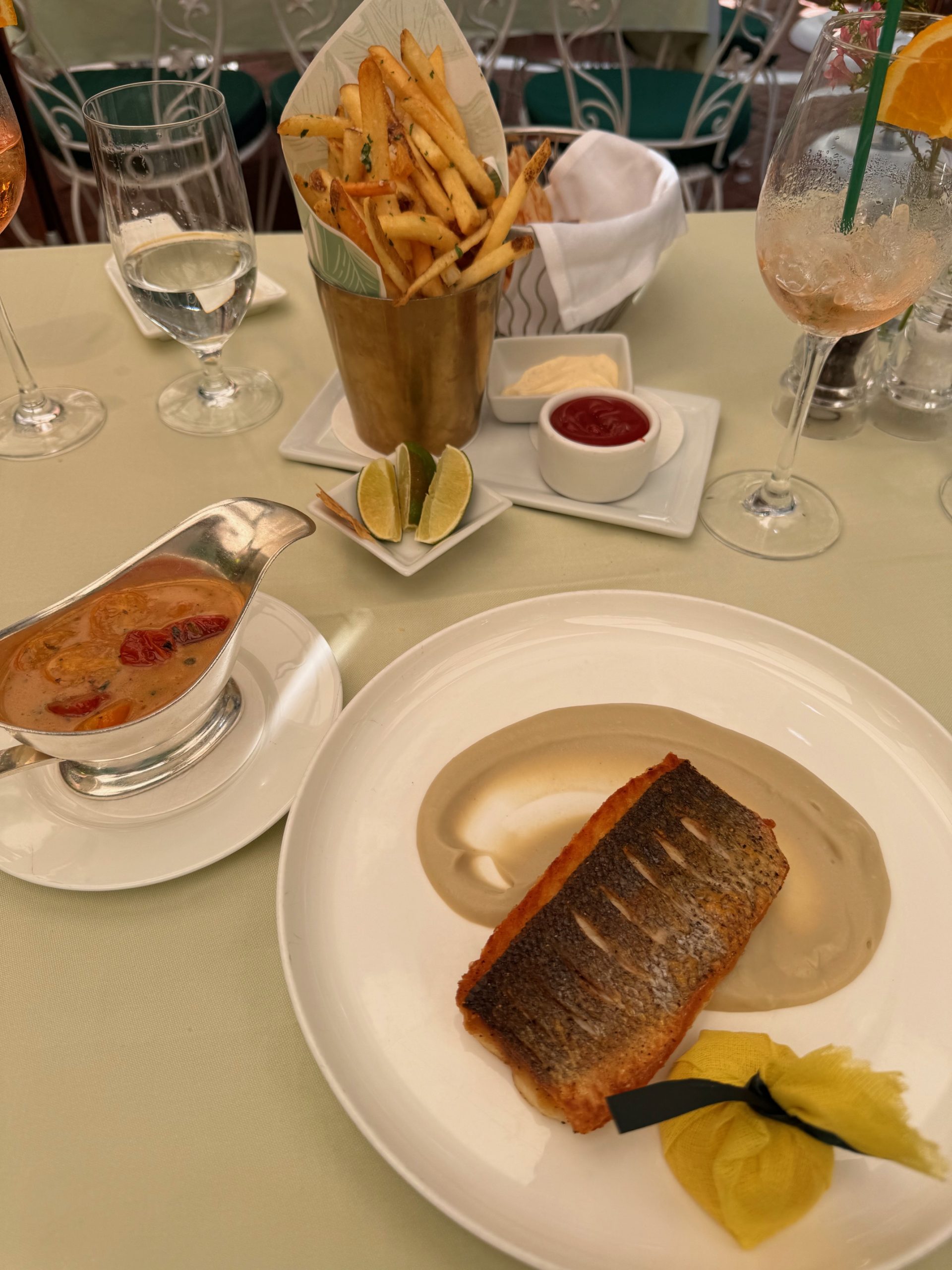 O cardápio muda conforme as estações, mas alguns clássicos atravessam décadas. Num dia de sol californiano, escolhemos almoçar no terraço, onde mesas se espalham como num jardim privado, embaladas pelo canto dos pássaros e pela brisa suave.
